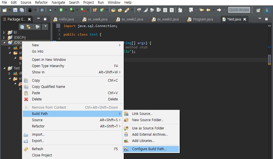프로젝트 생성 후, 해당 프로젝트 위에 오른쪽 버튼 -> Build Path -> Configure Build Path